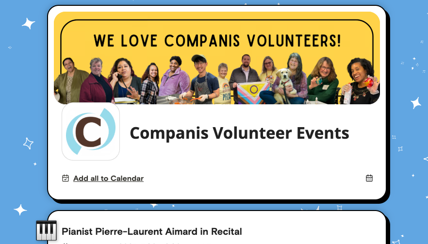Our events are inclusive & welcoming. If you are new to the Companis community, don’t fear! Our staff will orient you & introduce you to other amazing, likeminded volunteers!